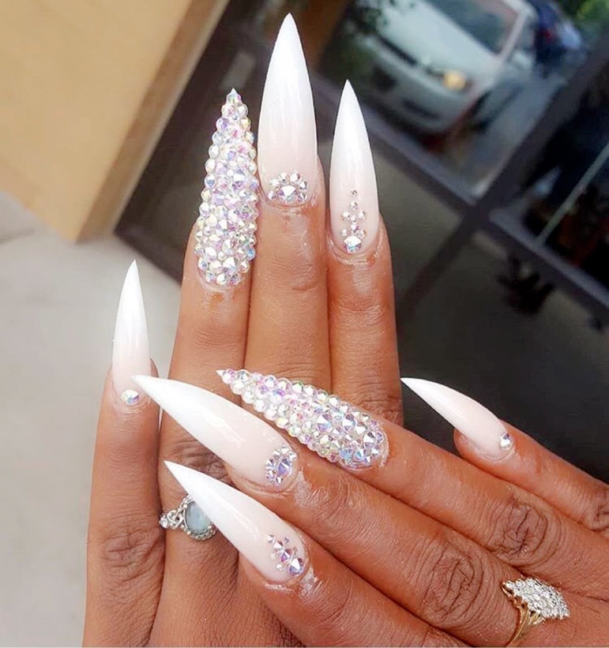 Маникюр на острые ногти со стразами